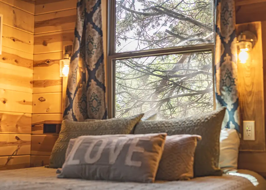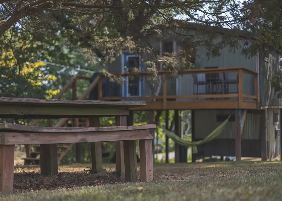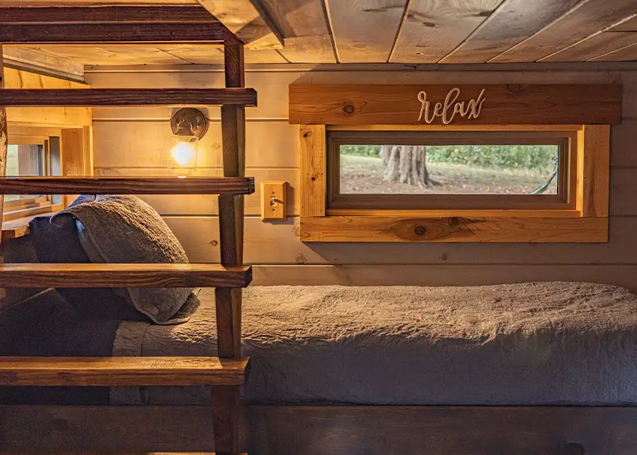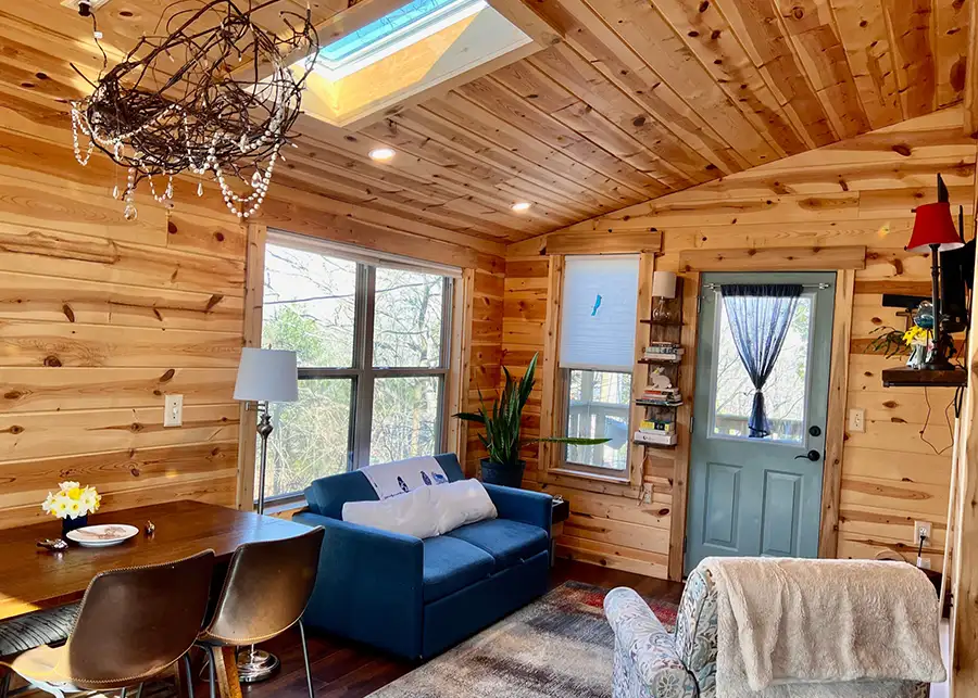 The Jaybird Treehouse is built beneath an oak tree and two tall pines. There is a queen bedroom on main floor and a trap door that leads to the downstairs with 3 twin beds. Includes Small Luxury bathroom with a rock river set in the floor, a glass shower door where the rock tile continues, a washer and dryer unit, and a unique sink made from a flowerpot.